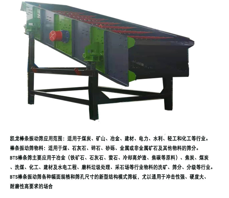 凱龍棒條振動(dòng)篩應(yīng)用范圍:適用于煤炭、礦山、冶金、建材、電力、水利、輕工和化工等行業(yè)。棒條振動(dòng)篩物料:適用于煤、石灰石、碎石、砂礫、金屬或非金屬礦石及其他物料的篩分。BTS棒條篩主要應(yīng)用于冶金(鐵礦石、石灰石、螢石、冷卻高爐渣、焦碳等原料)、焦炭、煤炭、洗煤、化工、建材及水電工程、磨料垃圾處理、采石場等行業(yè)物料的洗礦、篩分、分級(jí)等行業(yè)。BTS棒條振動(dòng)篩各種幅面規(guī)格和篩孔尺寸的新型結(jié)構(gòu)模式篩板,尤以通用于沖擊性強(qiáng)、硬度大、耐磨性高要求的場合。BTS棒條振動(dòng)篩在鐵礦石中細(xì)碎篩分、原煤分級(jí)、黃金、建材以及水電、核電工程砂石的篩分等用耐磨篩板。