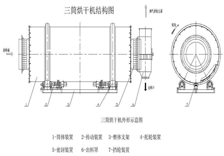 三筒烘干機是通過對單筒烘干機的單筒體改為套疊在一起的三筒,以縮短烘干機體的外形尺寸。該機工作時,物料和熱氣流依次進入內至外筒體,在機體Z形往復折流后,充分利用熱能烘干物料后再卸出。