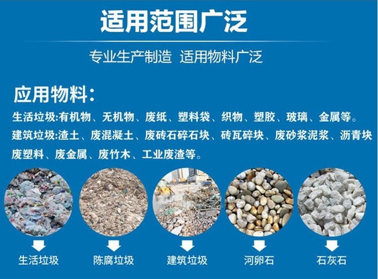 垃圾分揀成套設備主要通過鏟車、輸送、對輥撕包機、無軸滾篩、磁渦分選機、風選、收塵和氣處理等一系列流程。把原始物料中的銅鋁和有色金屬、鐵和磁性物、塑料橡膠、不銹鋼、重砂石、有機物和雜物、大衣物等各自分選開。純度可達98%左右。可以很好的處理各種城市垃圾。