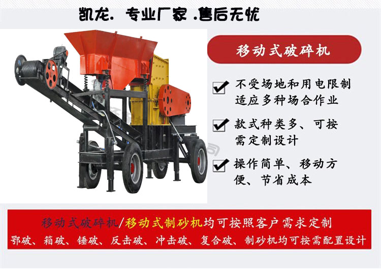 廠家直銷移動式破碎站,對玄武巖、花崗巖、石灰巖、鵝卵石、青石、金礦石、鐵礦石、煤矸石、建筑垃圾等均有良好粉碎效果,經上百家用戶使用設備后,反映良好,采購回頭率高達50%,讓設備效果說話,我廠設備質量可靠,售后服務完善,讓您買的放心!用的舒心!
